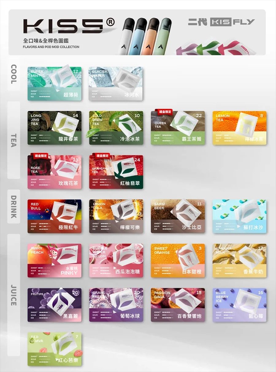 KISS FLY最新的 KIS5 五代煙彈,以卓越的設計和優異的擊喉感,再次提升您的電子煙體驗, 每一口都帶來飽滿的味道和豐富的煙霧,滿足您的各種需求。KISS 鎧斯五代煙彈提供多種口味選擇,從清爽的水果味到濃郁的茶味, 無論您是喜歡甜味還是偏好傳統水果香,都能找到適合自己的口味, 精心選擇成分調配的口味,每一口都能帶來愉悅的享受。